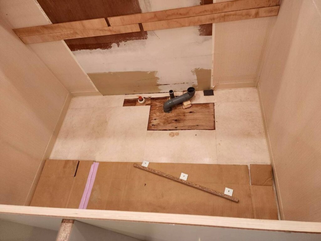 既存の洗面カウンターを撤去して、新しいカウンターをそのまま取付けするとミラーに干渉してしまい、うまく設置できないことが事前のサイズ計測で分かっていましたので、壁調整を行い、取付け作業を進めました。