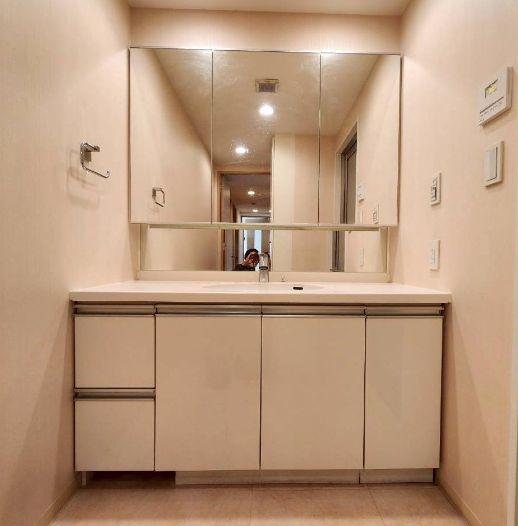 お写真を見てそのサイズ感にお気づきになられたかもしれませんが、一般的なものよりワイドサイズで、鏡もミラー下の通常パネル部分までミラー仕様となっているこだわりの洗面カウンターです。