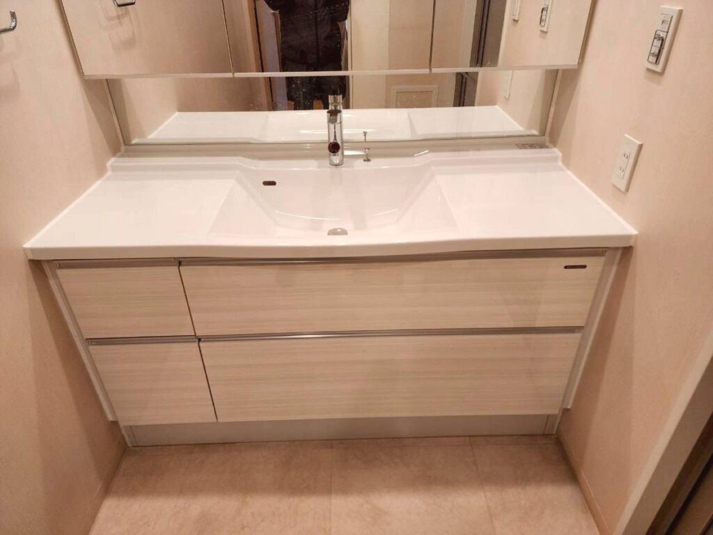 人造大理石製のカウンターや扉カラーも相まって、ピカピカの洗面カウンターが完成しました。